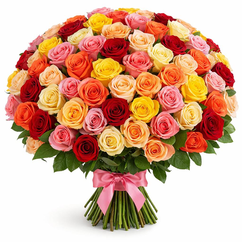 Роза Россия микс (кремовая, желтая, оранжевая, красная, розовая).