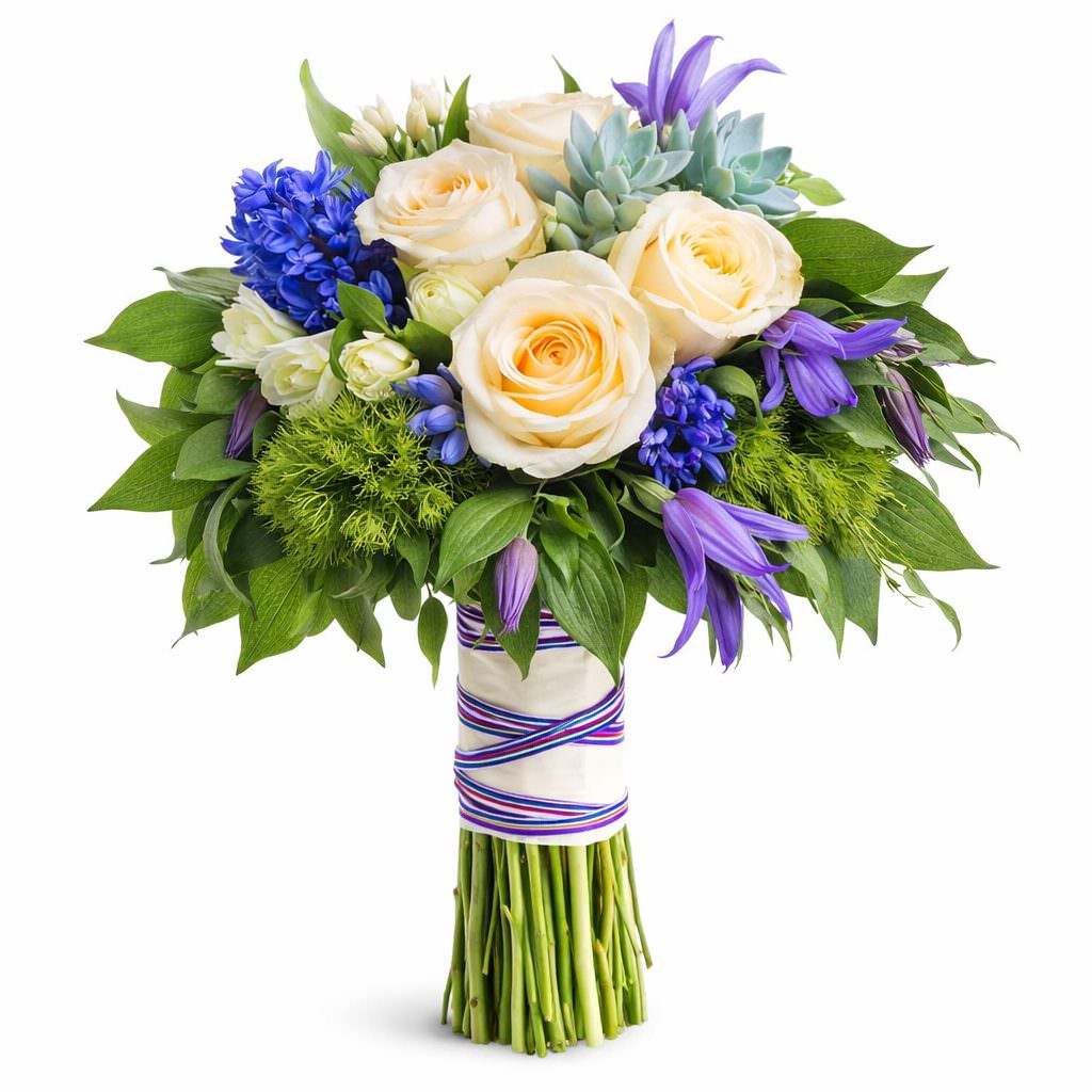 Роза одноголовая кремовая, гиацинт синий, клематис синий, суккулент, зелень. Упаковка (лента, пленка, крафт, сетка, пленка матовая)