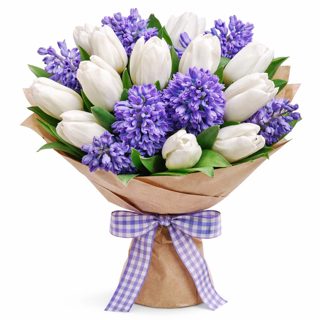Яркий контраст белых тюльпанов и синих гиацинтов создаёт атмосферу утончённой элегантности. Композиция обёрнута в крафт-бумагу и украшена клетчатой текстильной лентой. Этот букет наполнит пространство свежестью и светом. Подходит для вручения диплома для любимой женщины.