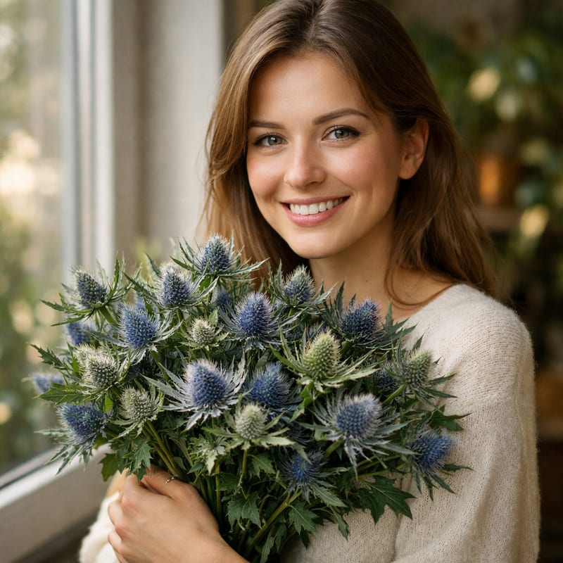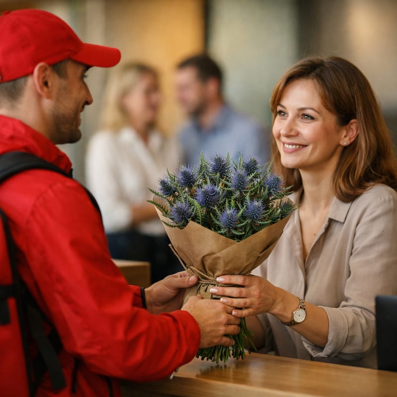 Букеты с эрингиумом — самый «графический» вариант: серебристо-голубые или фиолетовые «колючки» (синеголовник, морской чертополох) 3-5 см с резными листочками, идеально как декоративный акцент для бохо-букетов и зимних композиций. В галерее «МонаФлора» в Дудинке — букеты с эрингиумом от 2769 руб.: микс розы + эрингиум, эустома + эрингиум, бохо-композиции с сухоцветами. Востребованные идеи для свадебного букета (бохо/эко/винтаж), на день рождения зимой, для смелого подарка, для офиса. Доставка включена в стоимость от 500 руб., за 2 часа. См. Также с розами, с сухоцветами.