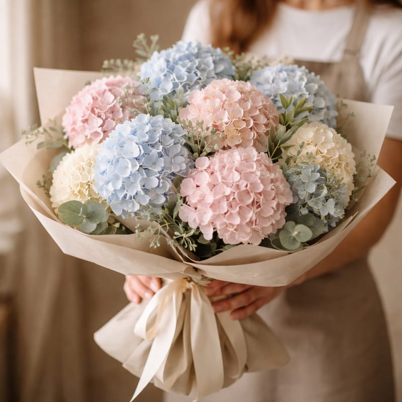 Белая, розовая, голубая, фиолетовая, зелёная (антик), бордовая. Оттенки определяются сортом и кислотностью почвы. На срезке самые популярные — белая, розовая, голубая. Зелёная антик — для дизайнерских букетов и оформления свадеб. Синяя гортензия — топ-1 для премиум-композиций мужчинам.