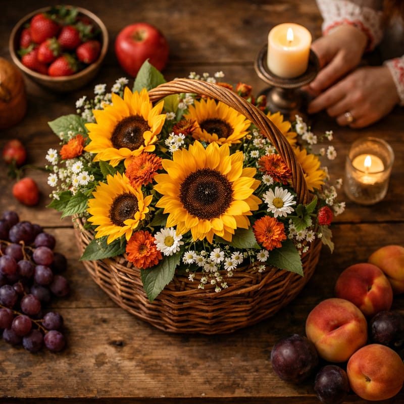 Подсолнухи в плетёной корзинке — самый «солнечный» рустик-подарок: огромные жёлтые «солнышки» 15-20 см + натуральная корзина с ручкой = «как с поля» в любую погоду. Мужской цветок, символ радости и оптимизма. В каталоге «МонаФлора» в Дудинке — готовые корзины с подсолнухами от 3429 руб.: моно 5-9 шт, миксы с розами и хризантемами, премиум на 1 сентября учителю. Трендовые варианты для мужчины, учителю, на 1 сентября, на дачу, ребёнку. Доставка бесплатная от 500 руб., быстрее 90% конкурентов. См. Также подсолнухи в коробке.