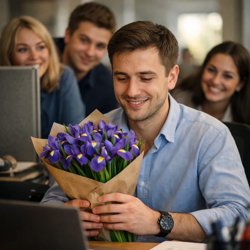 Да, ирисы — чудесный мужской цветок: строгая форма, насыщенный цвет, отсутствие сладкого аромата. На 23 февраля, день рождения коллеги, юбилей шефа — отличные виды из 7–11 синих или фиолетовых ирисов с эвкалиптом или гипсофилой. См. цветы для мужчины.
