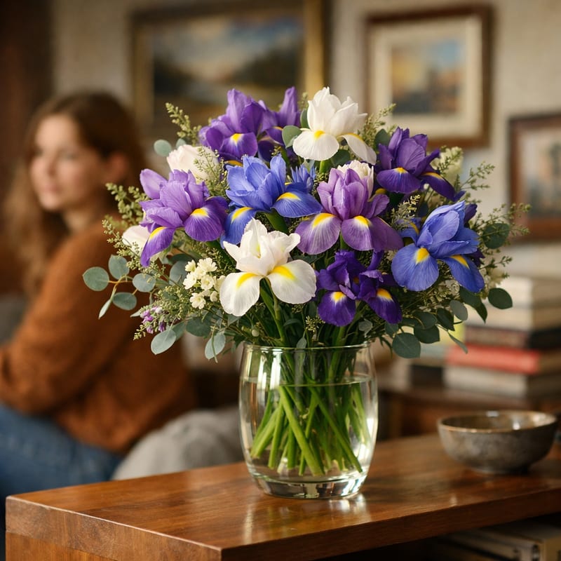 Чётное число — 6, 8, 10 для нейтральных подарков, нечётное 7, 11, 15 — на торжества. Моно-букет из 11 ирисов смотрится строго и стильно. Ирисы хорошо сочетаются с розами, тюльпанами, эвкалиптом, рускусом.